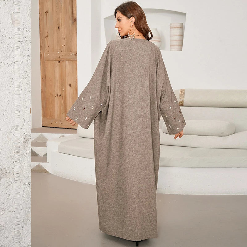 Elevate your modest wardrobe with this elegant open-front abaya cardigan, designed for effortless layering and everyday sophistication. Featuring a flowing silhouette and soft neutral tones, this piece blends modern minimalism with timeless Islamic modest wear.