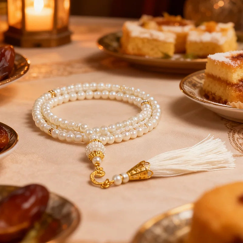 These prayer beads are ideal for personal use, mosque settings, or as thoughtful Ramadan and Eid gifts. The classic white pearl finish paired with gold-toned accents makes them suitable for all ages and both personal devotion and gifting occasions.