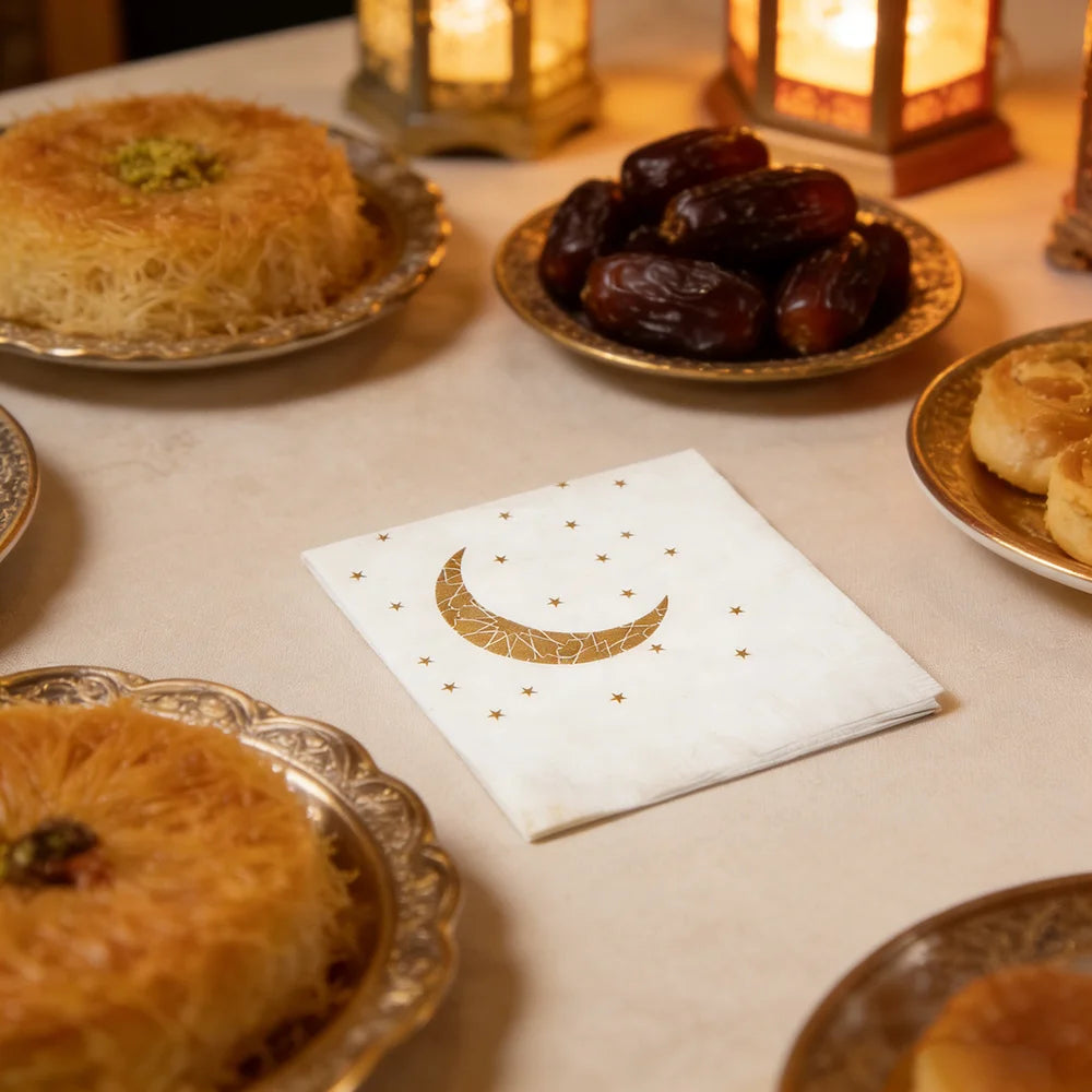 Elevate your Ramadan and Eid table setting with these elegant crescent moon and star paper napkins. Designed with a minimalist white base and refined gold Islamic detailing, they add a subtle yet festive touch to iftar dinners, Eid gatherings, and special celebrations.